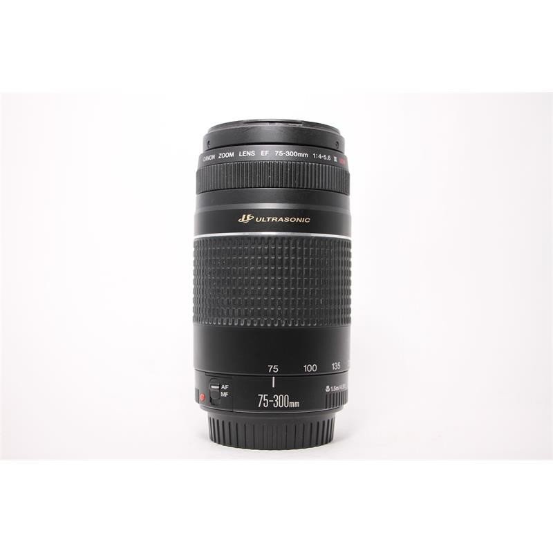 This Canon a EF 75-300mm f/4-5.6 II III USM Ultasonic Macro Telephoto Zoom Lens Diagonal Angle of View: 32° 11'-8° 15'- Lens Construction (elements/groups): 13/9- No. of Diaphragm blades: 7- Minimum Aperture: 32-45- Closest Focusing Distance (m): 1.5- Maximum Magnification (x): 0.25 (at 300mm)- Filter Diameter: 58mmThe lightest 4x telephoto zoom lens in its class. Ideal for sports, portraiture, animals, etc. The telephoto effect can make the picture look compressed or have excellent background blur. At the 300mm focal length, you can fill the frame with a postcard from 1.5 meters away.